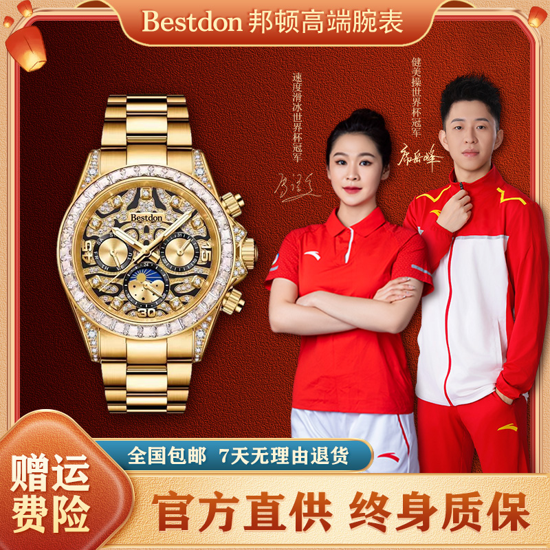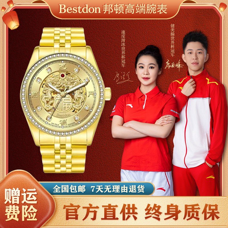 邦顿高奢全自动机械手表带夜光防水男士龙腾四海金色镶钻男表XYC