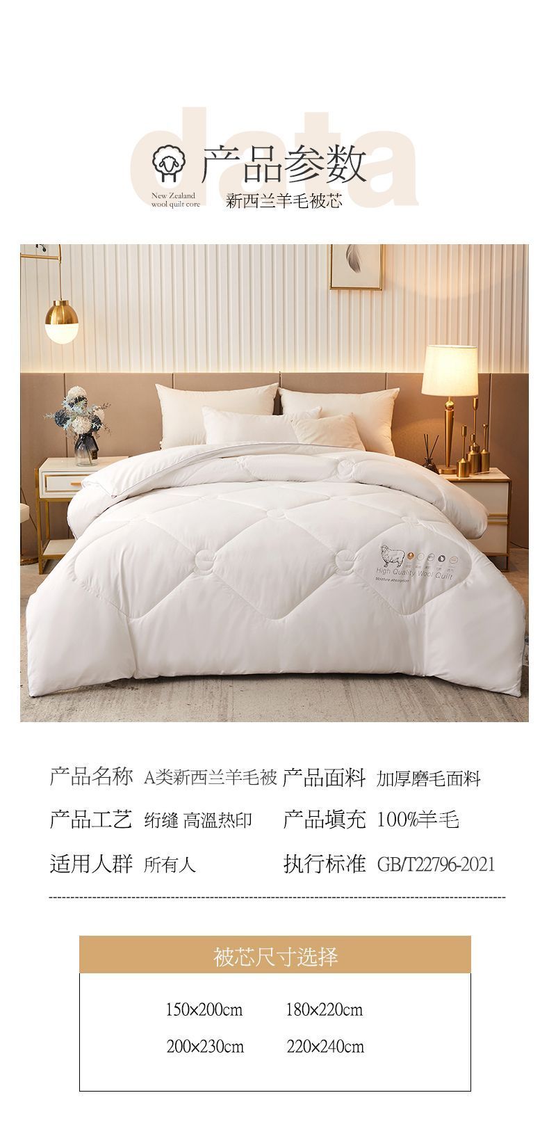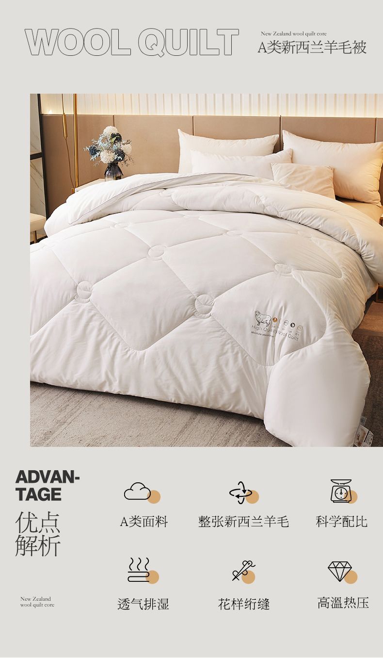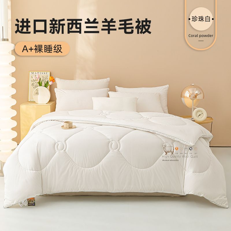 - 官方正品【已质检】白色220x240cm薄冬被【约8斤-新西兰进口100%羊毛】